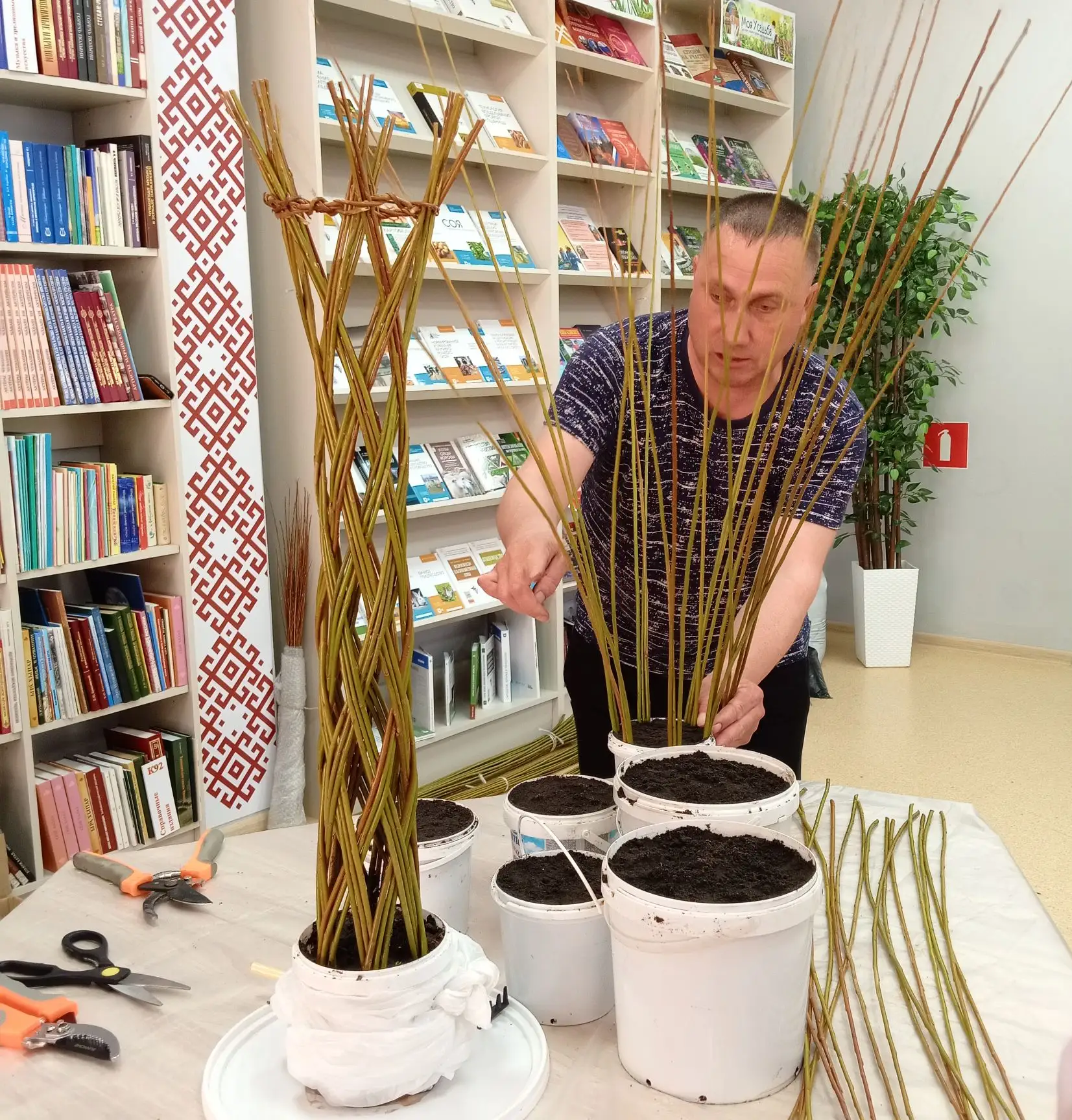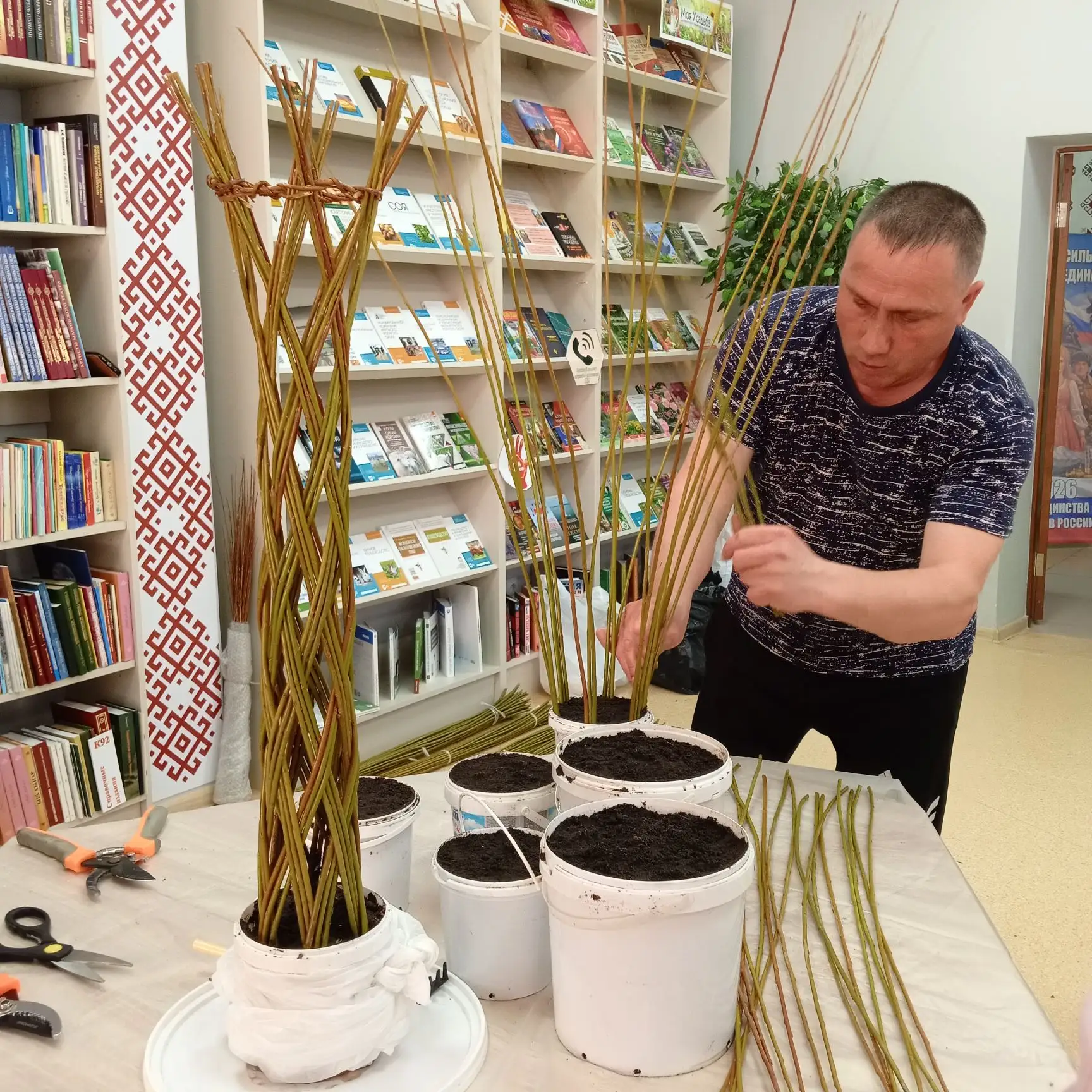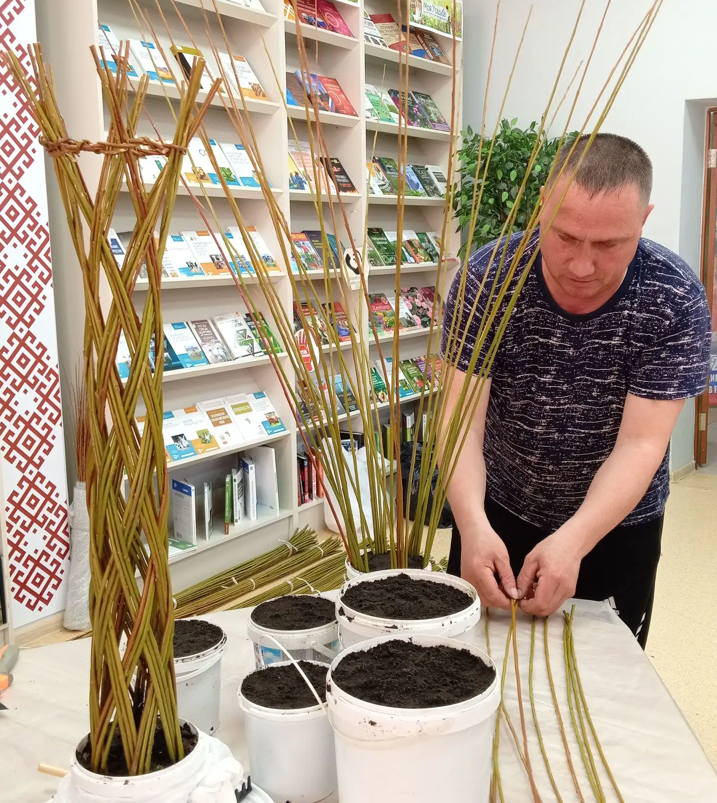Мастер-класс по плетению из ивовой лозы «Живое деревцо» - это настоящее погружение в мир природного творчества! Николай Чубайкин поделился своим богатым опытом, открыв участникам все тонкости работы с этим живым материалом. Он подробно рассказал, как выбрать самые лучшие прутья, как подготовить их к работе, чтобы они стали податливыми и послушными, словно пластилин. Особое внимание было уделено созданию изящных, воздушных узоров, которые придают изделиям неповторимую легкость и шарм.