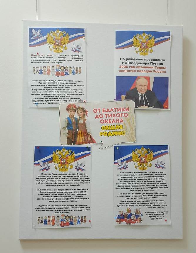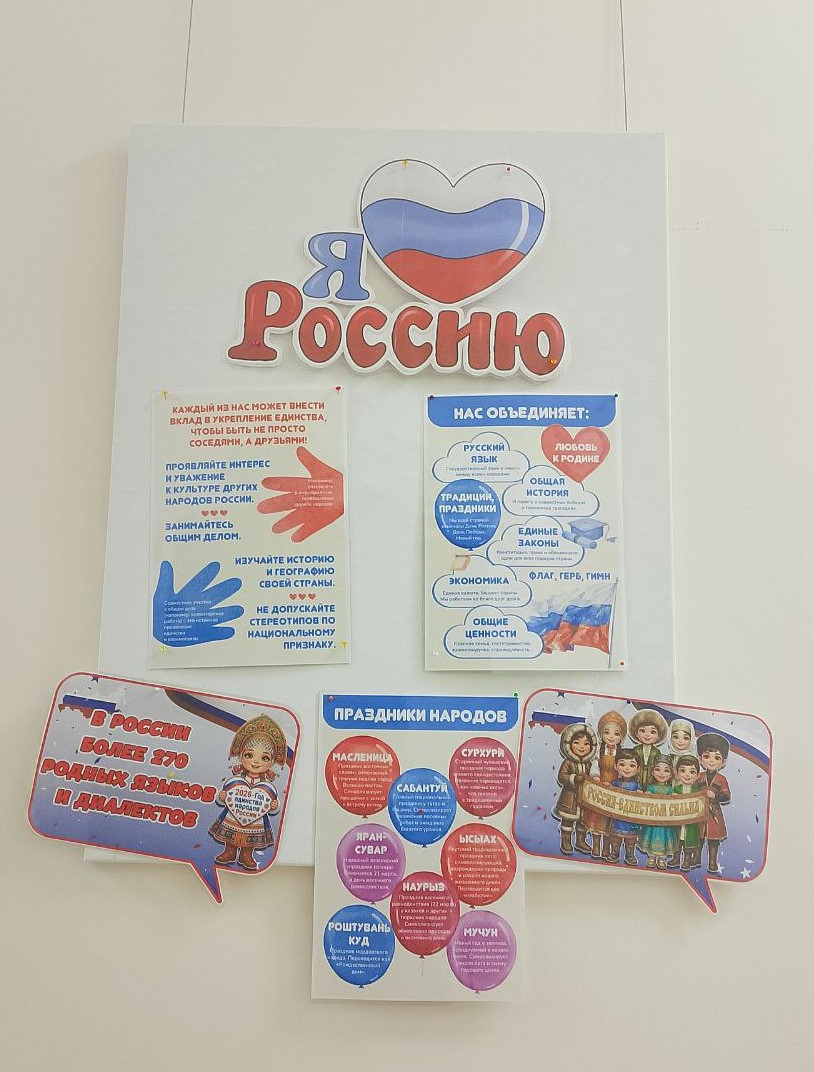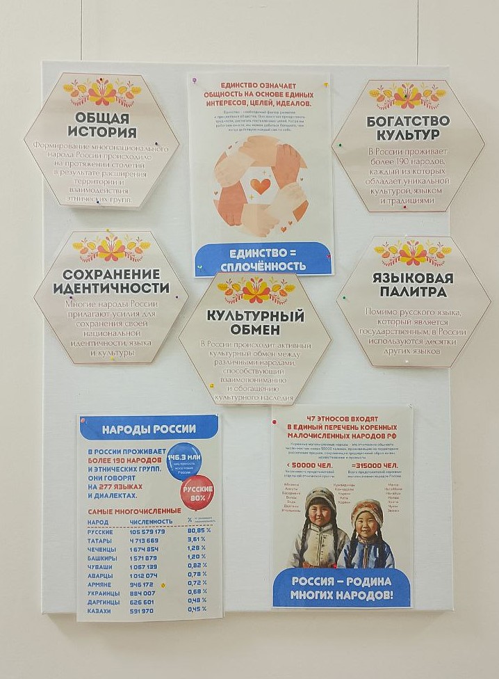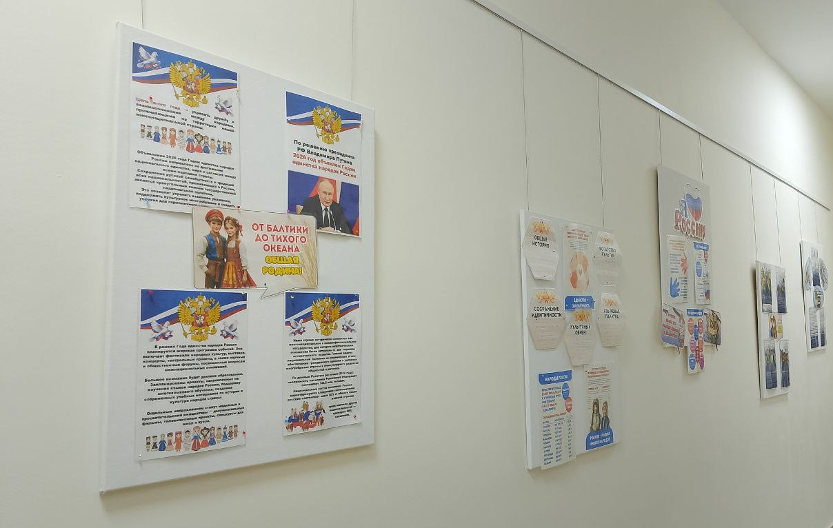 Россия — удивительная страна с богатой историей и многонациональной культурой. На протяжении веков сотни народов из разных уголков объединялись в единую нацию, сохраняя при этом свои традиции и обычаи. Это многообразие — наша сила, и сегодня, в условиях современности, мы особенно остро осознаём важность его сохранения и укрепления национального самосознания. Одним из ключевых факторов единства народов России является общий язык — русский. Он объединяет людей разных национальностей и помогает им общаться и понимать друг друга. Однако язык — не единственный элемент, способствующий единству. Общая история, основанная на исторических, культурных и государственных факторах, также играет важную роль. Она укрепляет связи между народами и создаёт уникальную страну. Государственные символы и традиции — ещё один важный элемент формирования единства. Государственный флаг, герб и гимн России вызывают у граждан чувство гордости и принадлежности к Родине. Они объединяют всех, независимо от этнической принадлежности, и способствуют формированию национального самосознания. В связи с объявлением 2026 года Годом единства народов России, в коридоре Центральной библиотеки была оформлена иллюстративная выставка «В единстве народов сила России». Эта выставка знакомит посетителей с культурным многообразием страны и помогает им лучше понять и уважать традиции других народов. На выставке представлены материалы, которые рассказывают о том, что все россияне, независимо от социального статуса, национальности или вероисповедания, — единый народ с общей исторической судьбой. Литература на выставке охватывает разные аспекты жизни России: от истории государства и его символики до государственного устройства и современных реалий. Читатели могут узнать о географическом положении страны, достопримечательностях отдельных городов, обычаях народов и наследии национальных литератур. Выставка в библиотеке — это прекрасный пример того, как литература может объединить людей и помочь им лучше понять друг друга. Она напоминает нам о важности сохранения культурного наследия и укрепления национального самосознания в условиях многонациональной и многокультурной страны.