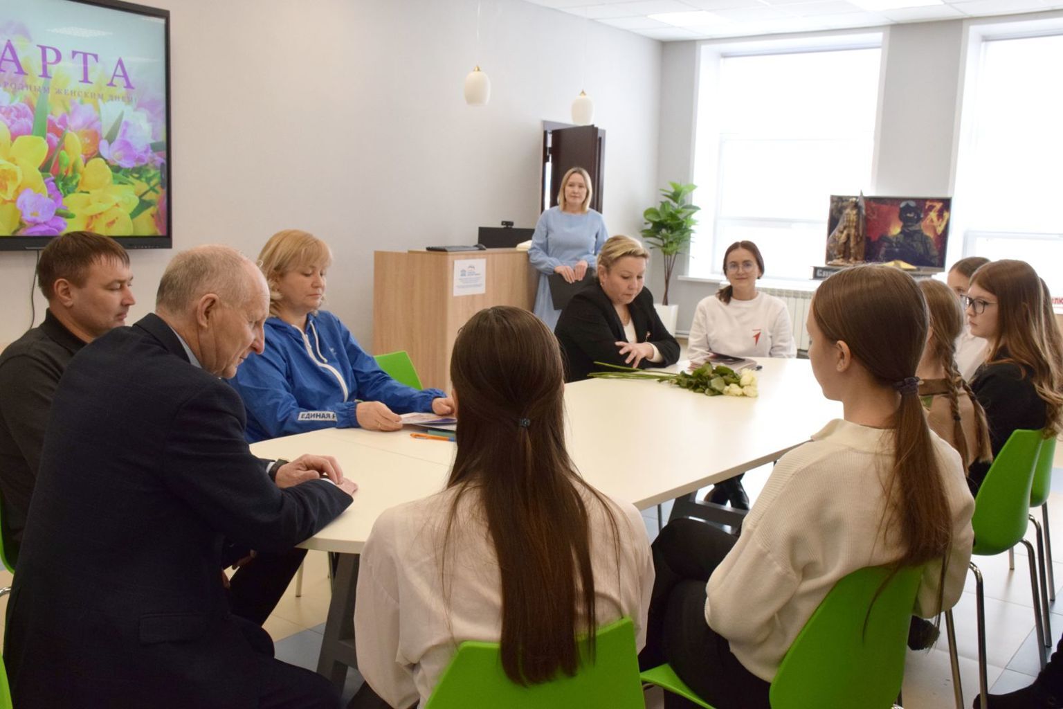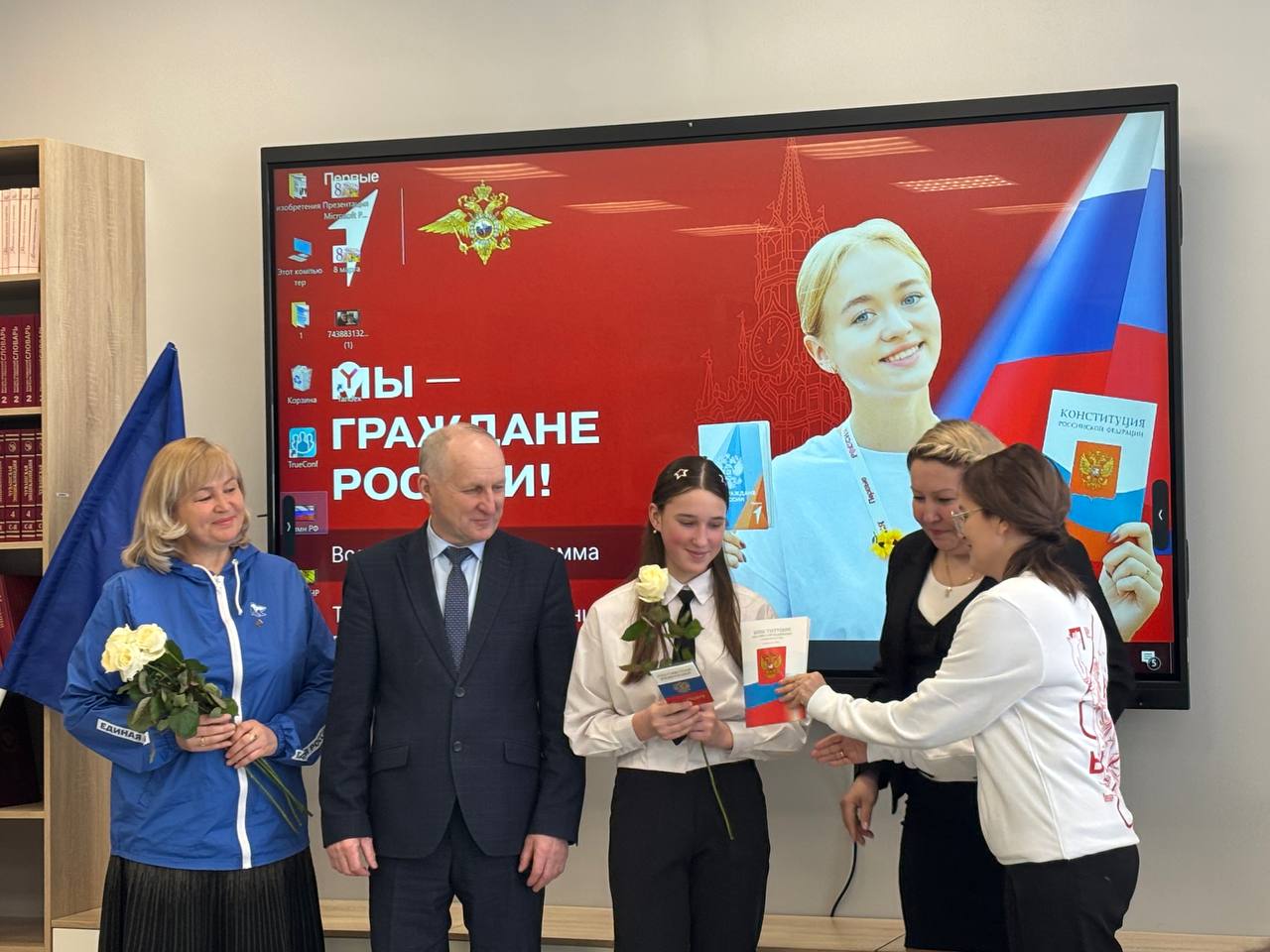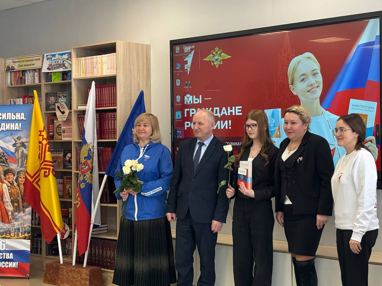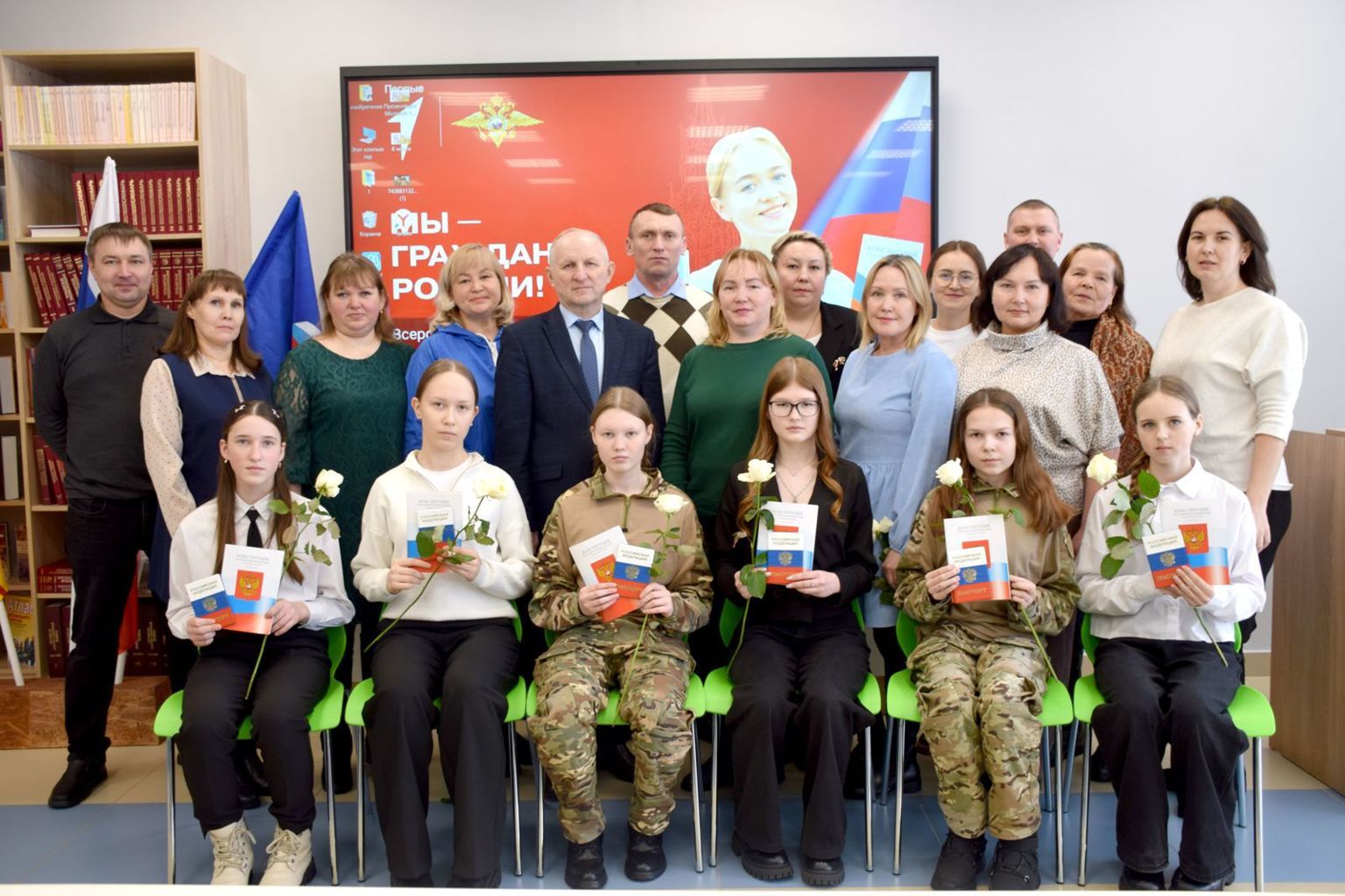 Накануне Международного женского дня шесть юных жительниц нашего округа впервые получили паспорта граждан России. Поздравлять девочек собрались глава муниципального округа Иван Николаевич Михопаров, главный специалист миграционного пункта Елена Геннадьевна Шорникова, начальник отдела правового обеспечения администрации округа Владимир Владимирович Михеев, исполнительный секретарь местного отделения партии «Единая Россия» Лилия Михайловна Иванова и специалист по организации работы в муниципальном округе «Движения Первых» Арина Михайловна Элеменкина.